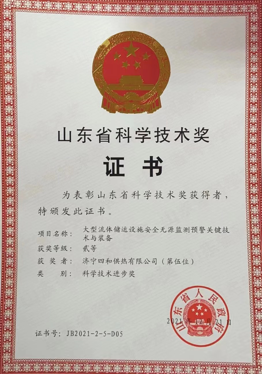 創(chuàng)新驅(qū)動(dòng)發(fā)展、技術(shù)制勝未來。近日,山東省人民政府發(fā)布《關(guān)于2021年山東省科學(xué)技術(shù)獎(jiǎng)勵(lì)的決定》,正式公布山東省科學(xué)技術(shù)獎(jiǎng)獲獎(jiǎng)名單,對(duì)為山東省科學(xué)技術(shù)進(jìn)步、經(jīng)濟(jì)社會(huì)發(fā)展作出突出貢獻(xiàn)的科學(xué)技術(shù)人員和組織給予獎(jiǎng)勵(lì)。濟(jì)寧四和供熱有限公司參與完成的“大型流體儲(chǔ)運(yùn)設(shè)施安全無源監(jiān)測(cè)預(yù)警關(guān)鍵技術(shù)與裝備”項(xiàng)目名列其中,榮獲“山東省科學(xué)技術(shù)獎(jiǎng)二等獎(jiǎng)”。